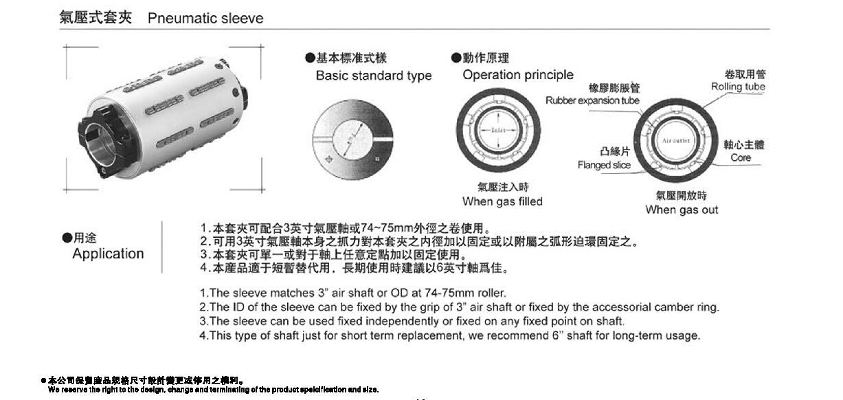 氣壓式套夾廣泛應(yīng)用于包裝薄膜行業(yè),而且氣脹套的主要規(guī)格尺寸是3英寸轉(zhuǎn)6英寸氣脹套,所以說氣脹套都是結(jié)合氣脹軸一起使用的。在氣脹套的結(jié)構(gòu)種類來分的話,有鍵式氣脹套;板式氣脹套;橡膠氣脹套等。它廣泛應(yīng)用于包裝印刷行業(yè)等,深受廣大朋友的認可與喜愛。