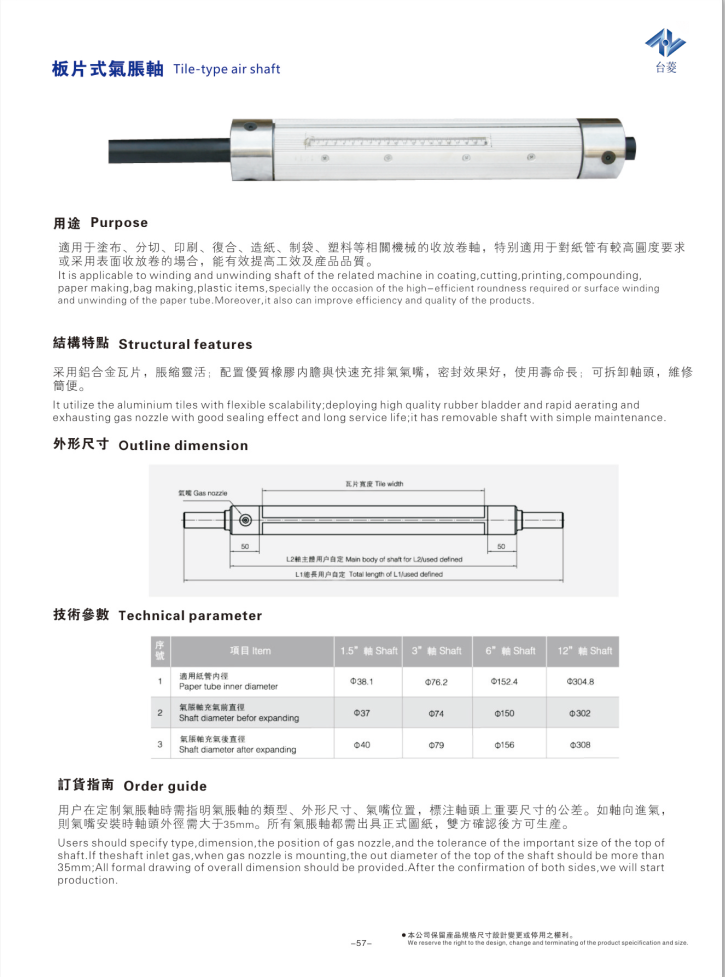 板條式氣脹軸又稱板條式氣壓軸,由氣脹軸(氣漲軸)和長(zhǎng)條脹瓦兩部分組成,沒(méi)有滑差功能(因其結(jié)構(gòu)脹瓦為通軸一長(zhǎng)條,無(wú)分節(jié)),由充氣壓力大小調(diào)節(jié)脹瓦扭矩力大小。板條式氣脹軸具有充氣時(shí)間短、經(jīng)濟(jì)效率高、承載量大、紙管放置簡(jiǎn)單、可拆卸軸頭、保養(yǎng)維修簡(jiǎn)便等等優(yōu)點(diǎn),板條式氣脹軸采用鋁合金板條、膨脹部分是板片、漲縮靈活、支點(diǎn)勻散、受力均勻、通常脹起高度可達(dá)4mm至5mm,可適用收卷精密度較高的機(jī)械或收卷較輕的物品。